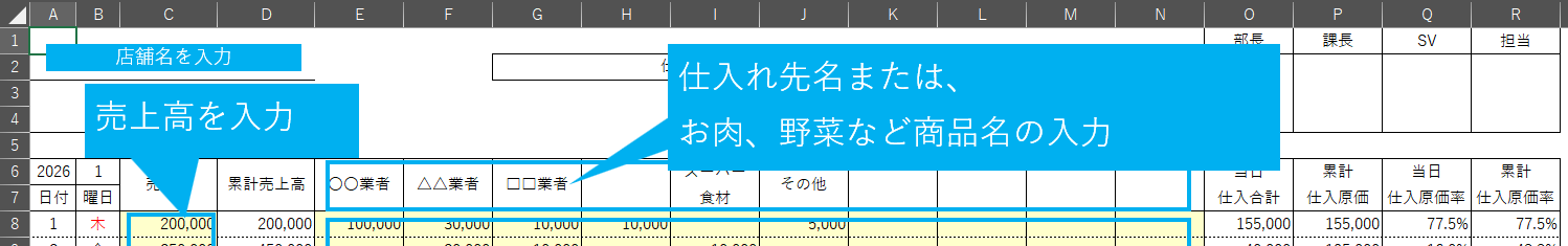 あとは、店舗名や仕入れ業者名(食材名)、目標仕入原価率を入力すればご使用いただけます。