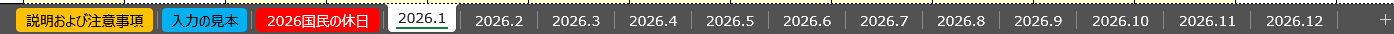 2026年版 仕入原価管理表は、すでに各月ごとにシートが分かれており、2026年度の月日と曜日・祝日も設定されています。